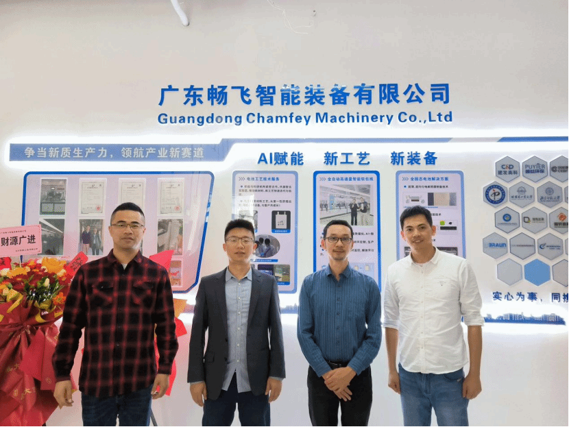 在广东畅飞智能装备有限公司,考察团在总经理徐腾飞的带领下参观了企业为锂电池生产企业开发的高度智能化中试线与生产线,与企业就实习基地建设、科研平台建设、科技合作等内容进行洽谈,并达成初步合作意向。