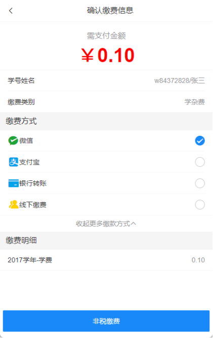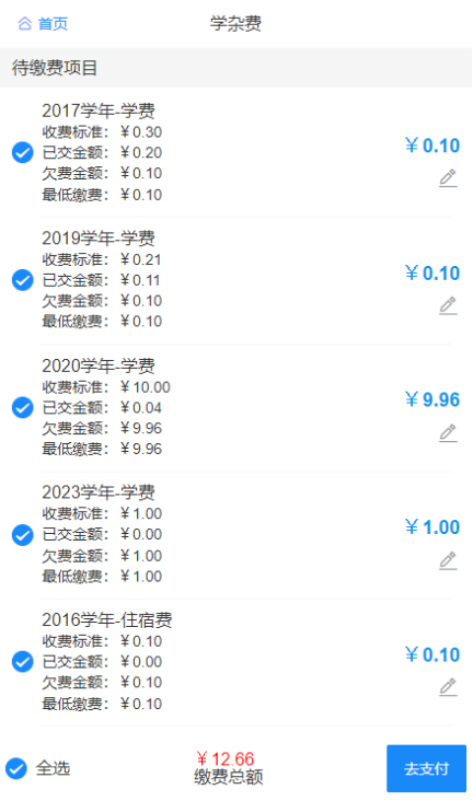 5、选择“学杂费”缴纳学费、住宿费等项目,确认缴费金额无误后点击“去支付”