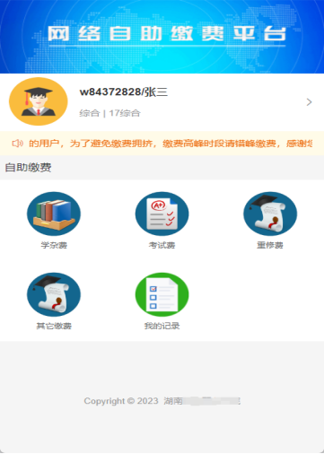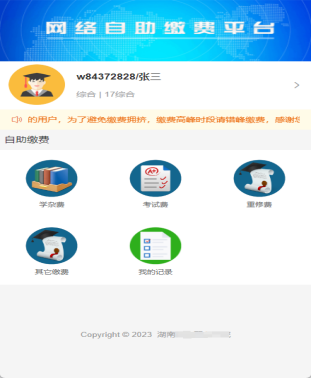 4、登录平台后自助选择缴费类别。学杂费(学费、住宿费、书籍教材费....);考试费(单招报名、普通话报名费、职称评审费....);重修费(学分重修费);其他缴费(水电费、会议费、培训费...)。