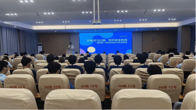 抵达三一工学院后,同学们参加了在职教大楼101会议室举行的实习安排部署暨安全培训专题会议。三一工学院副校长贺良、学工处处长何金星、培训处处长高峰出席会议,品色堂